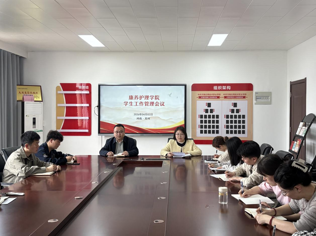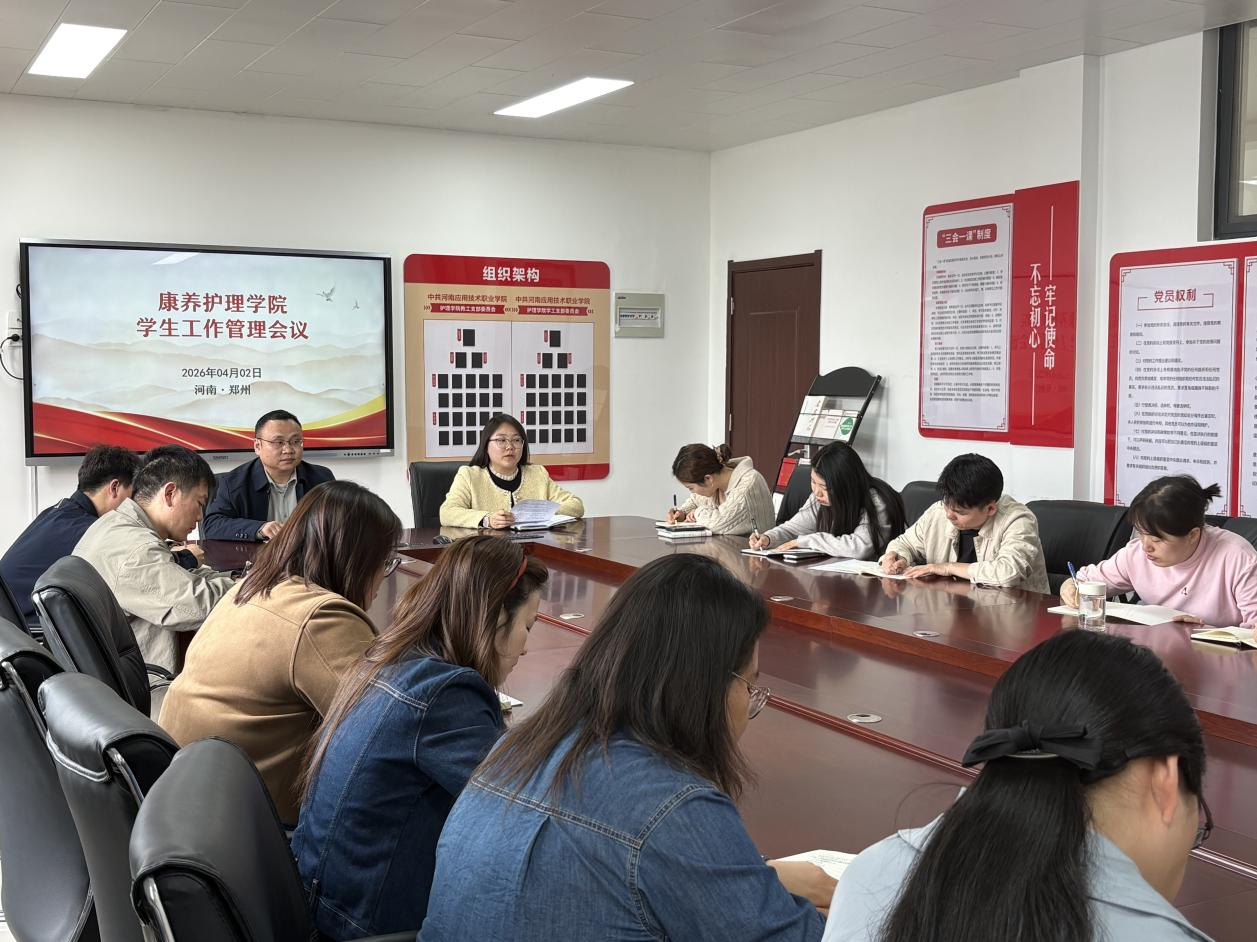 2026年4月2日,康养世俱杯买球官网网站召开学生管理工作会议,全面总结开学以来学生管理工作成效,统筹部署学生日常管理、寝室安全、清明节假期安全保障及春季运动会筹备等重点任务。学院党总支书记张忠勇、副书记景淼及全体辅导员参会。