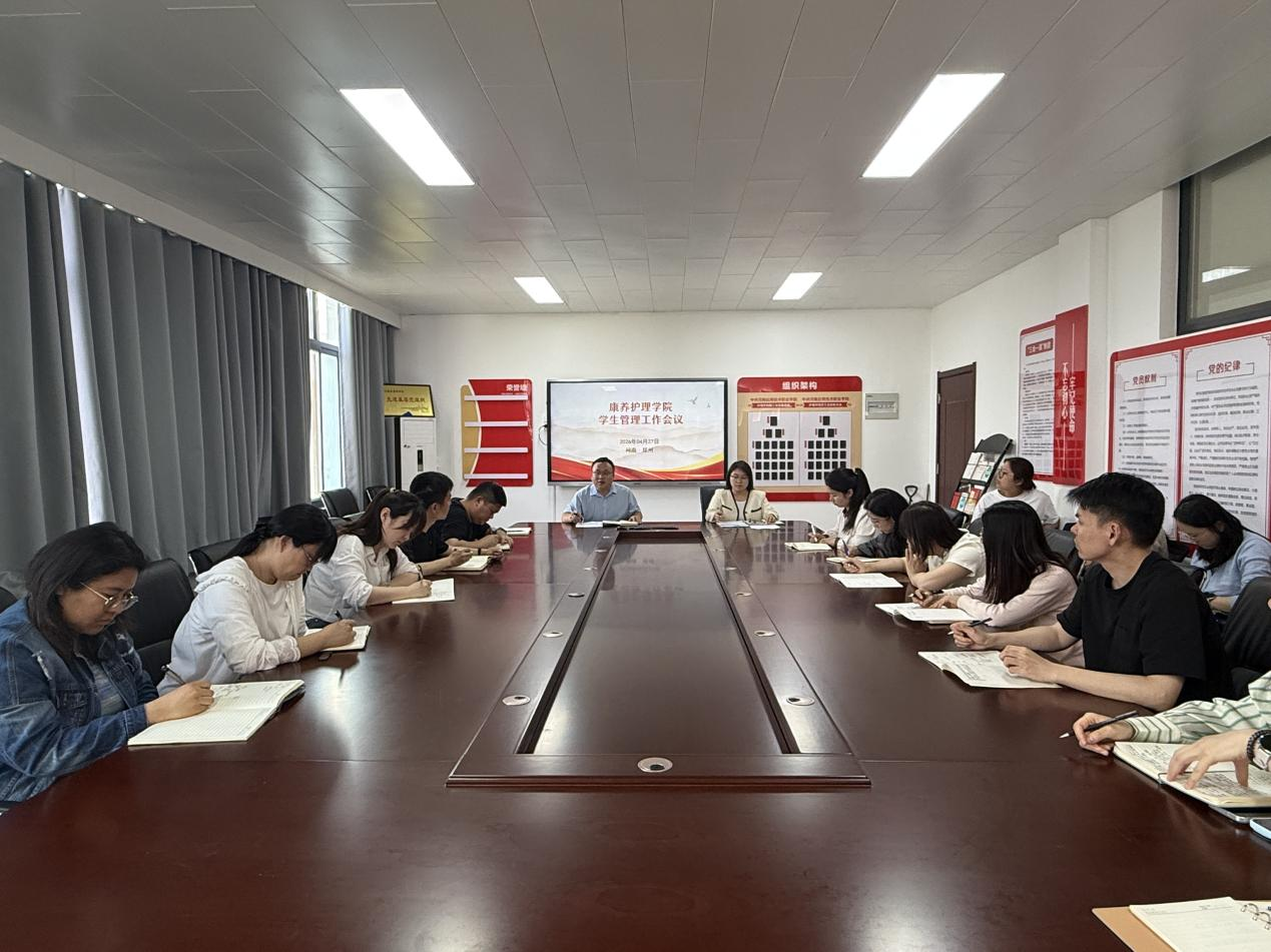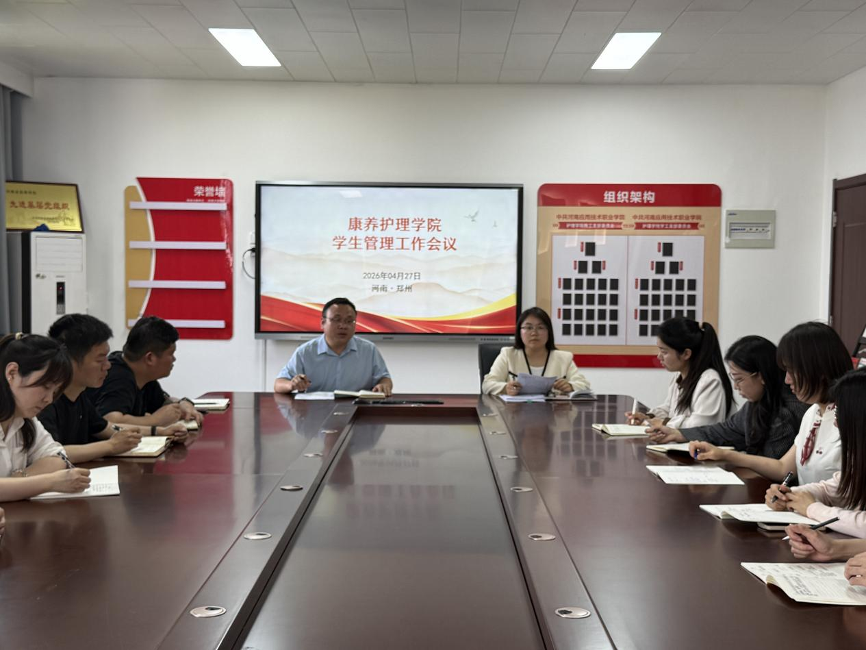2026年4月27日,康养世俱杯买球官网网站召开学生管理工作专题会议,全面复盘近期学生管理工作成效,统筹部署日常管理、寝室安全、五一假期安全保障及2026届毕业生资格审查等核心任务。学院党总支书记张忠勇、副书记景淼及全体专兼职辅导员参会。