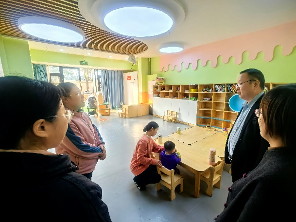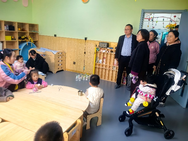 活动伊始,托育中心园长郭治海带领大家实地参观了托育中心的婴幼儿活动区、营养膳食厨房、睡眠区等功能区域,详细介绍了中心的师资配置、课程设置、安全管理及运营规模等情况,让学校老师对现代化托育机构的运营模式有了直观且深入的了解。
